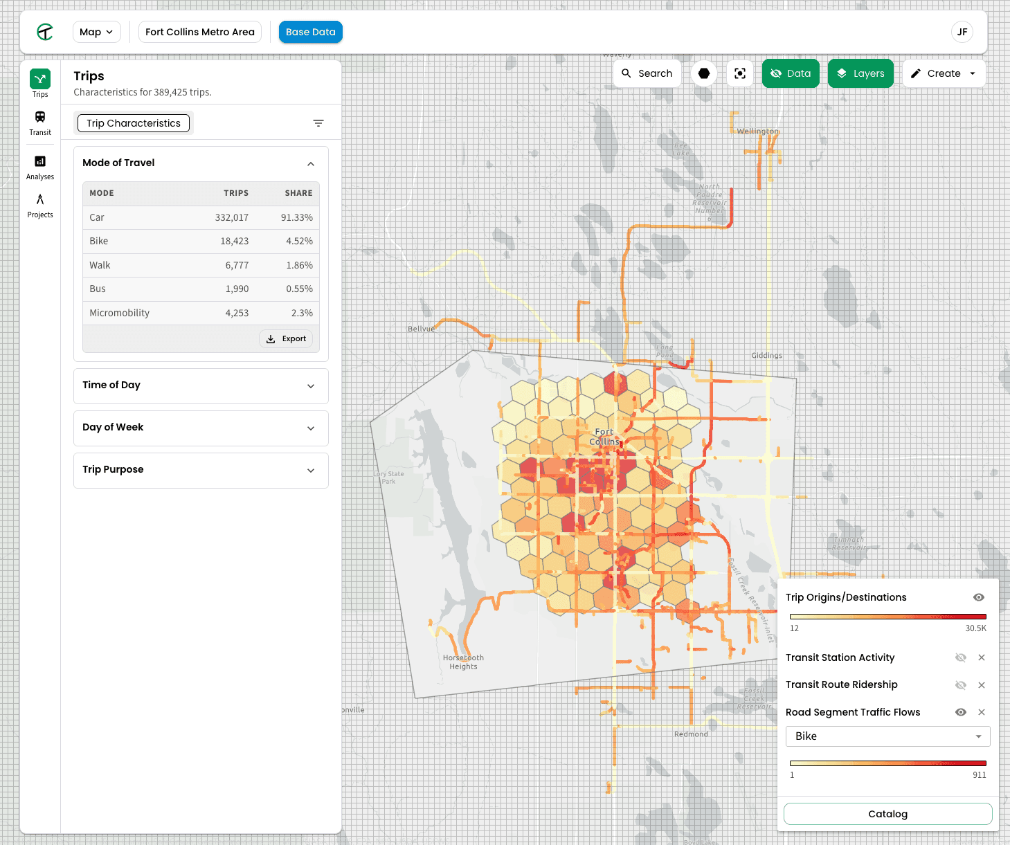 We reproduce the holistic ground-level conditions of every traveler and trip so you can effectively anticipate how real people will respond to changes and how your projects move the needle on access, mode shift, emissions, and more.